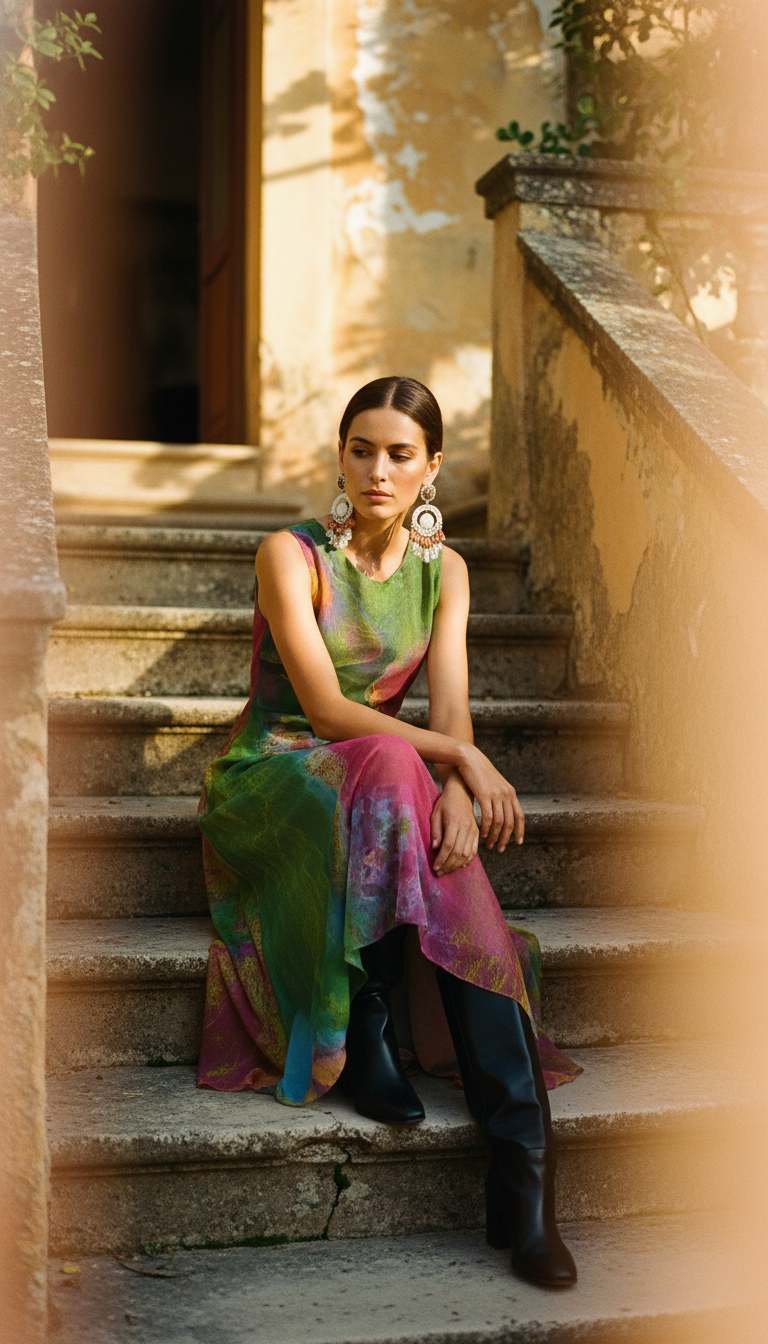 Su estampa de tonos vibrantes —entre rosas, verdes y dorados— parece pintada por el sol del amanecer. La silueta fluida acompaña el movimiento con suavidad, dejando entrever la fuerza tranquila de quien habita su raíz.